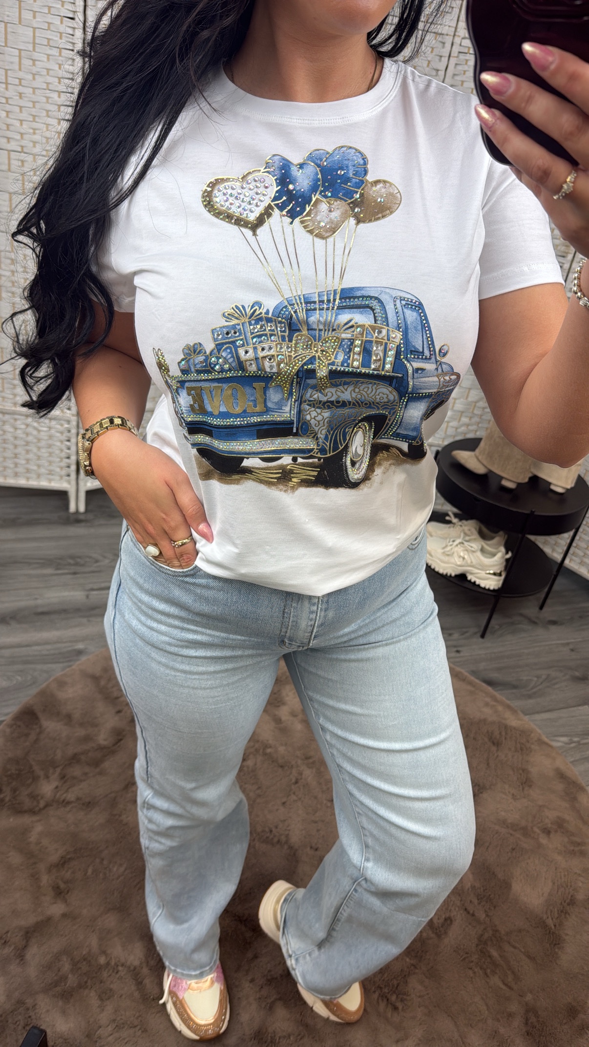 Zo leuk deze shirts! Letterlijk te combineren met alles! Ze zijn een maat te dragen tot L/XL. Het model is 1.67. Wij geven geen garantie op steentjes!